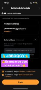 2️⃣ Pide la tarjeta virtual poniendo de nuevo el código JBBOQGY (apartado Referral Code).